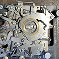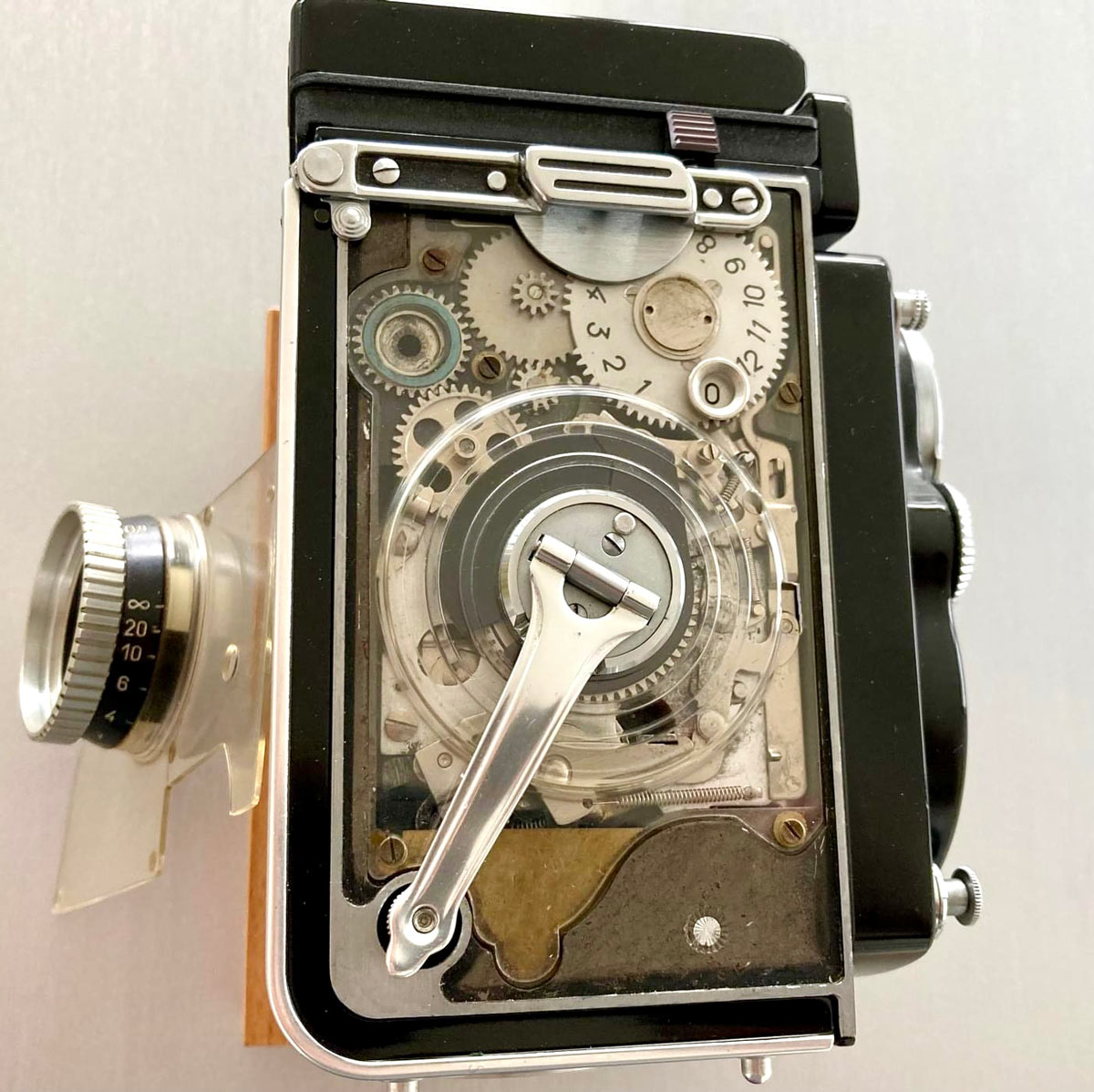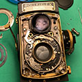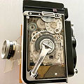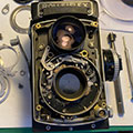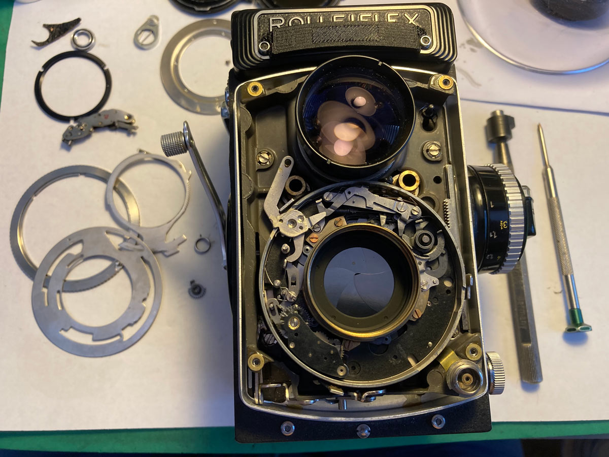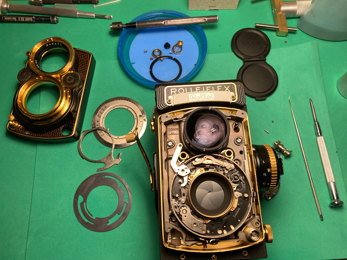 Zwei Kameras aus meiner Werkstatt mit offenem Gehäuse, eine Rolleiflex SL 350 (oben) und eine Rolleiflex TLR (oben rechts):